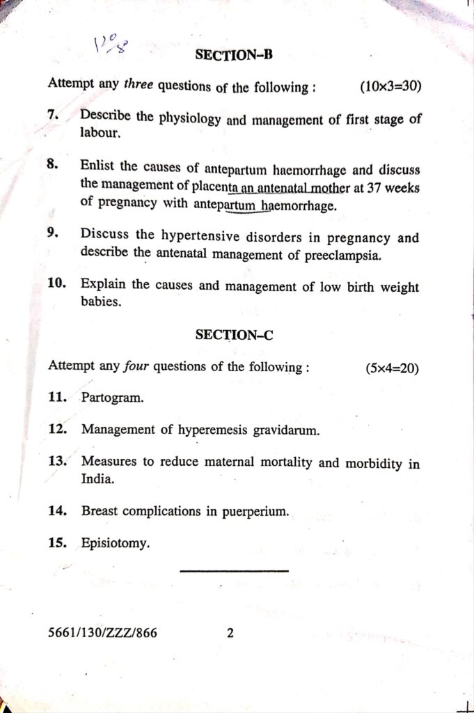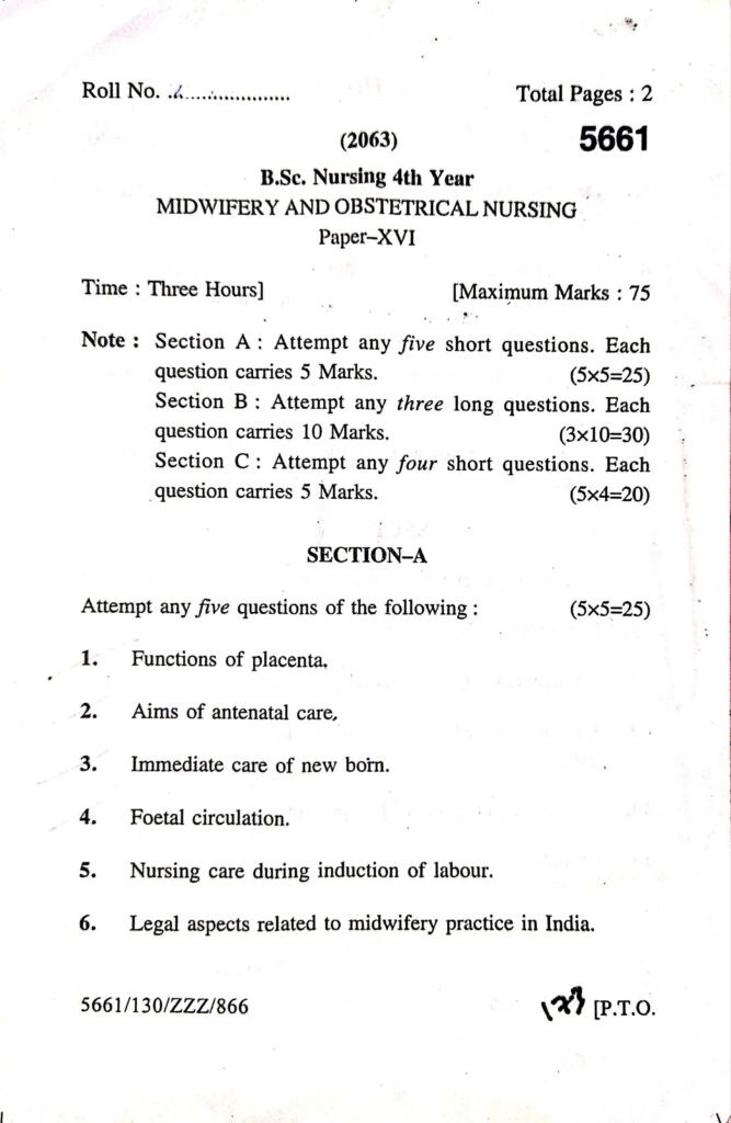 Bsc. Nursing 4rth year OBG (obstetrics and gynecology) university question paper 2023